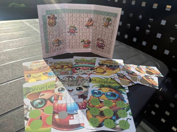 Hier bekommst du eine 3er Klappkarte mit Aktionsfelder und die 7 passenden Aktionskarten.