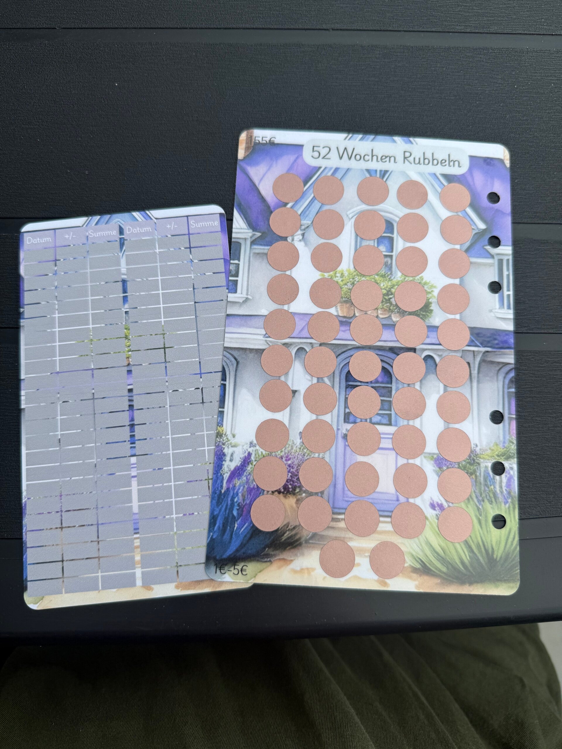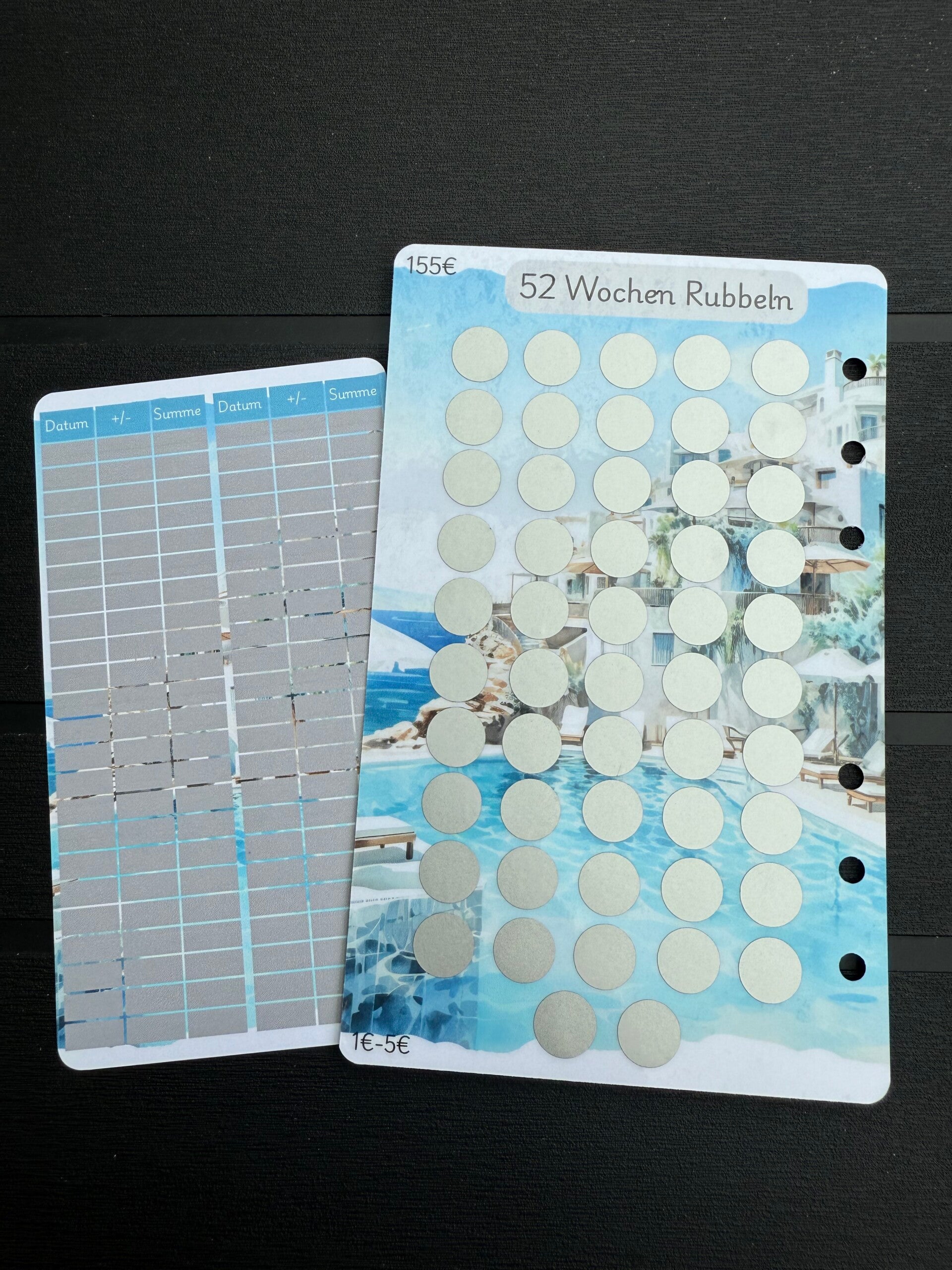 auf der Vorderseite befindet sich das 26 Wochen Rubbeln udn auf der Rückseite das 52 Wochen Rubbeln dazu gibt es einen doppelseitigen Tracker